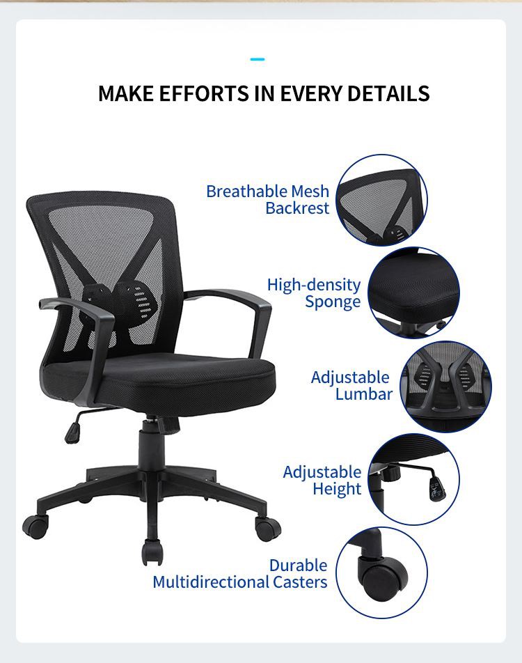 *快適な人間工学に基づいたオフィスチェア。 360度回転と高さ調整機能。 通気性のある生地と材木サポートが脊椎をしっかりと保護します。